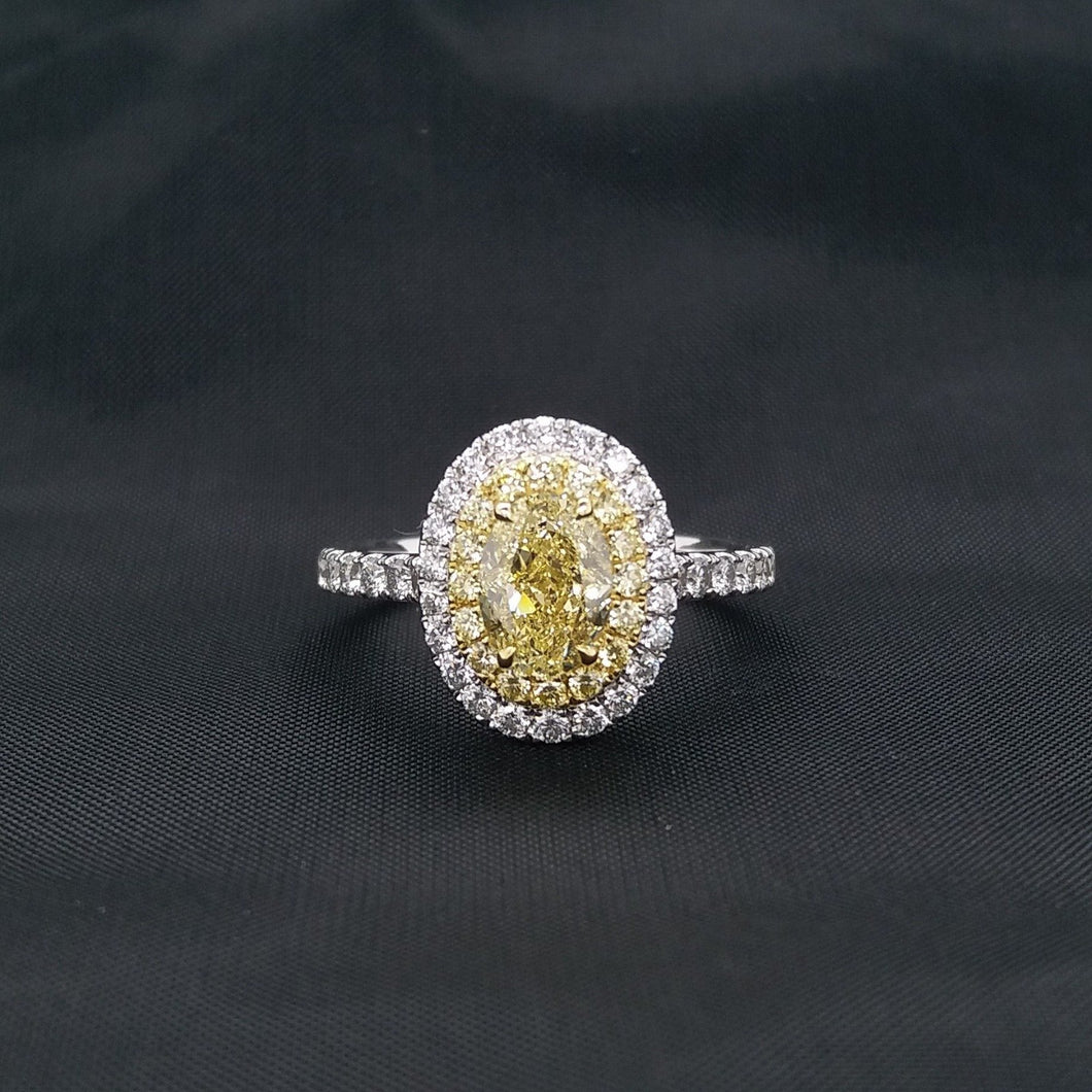 This design features a 1 carat Fancy Yellow GIA certified diamond at the center set in a double halo of yellow and white diamonds. The setting has pave diamonds along the band and it's 18K white gold.